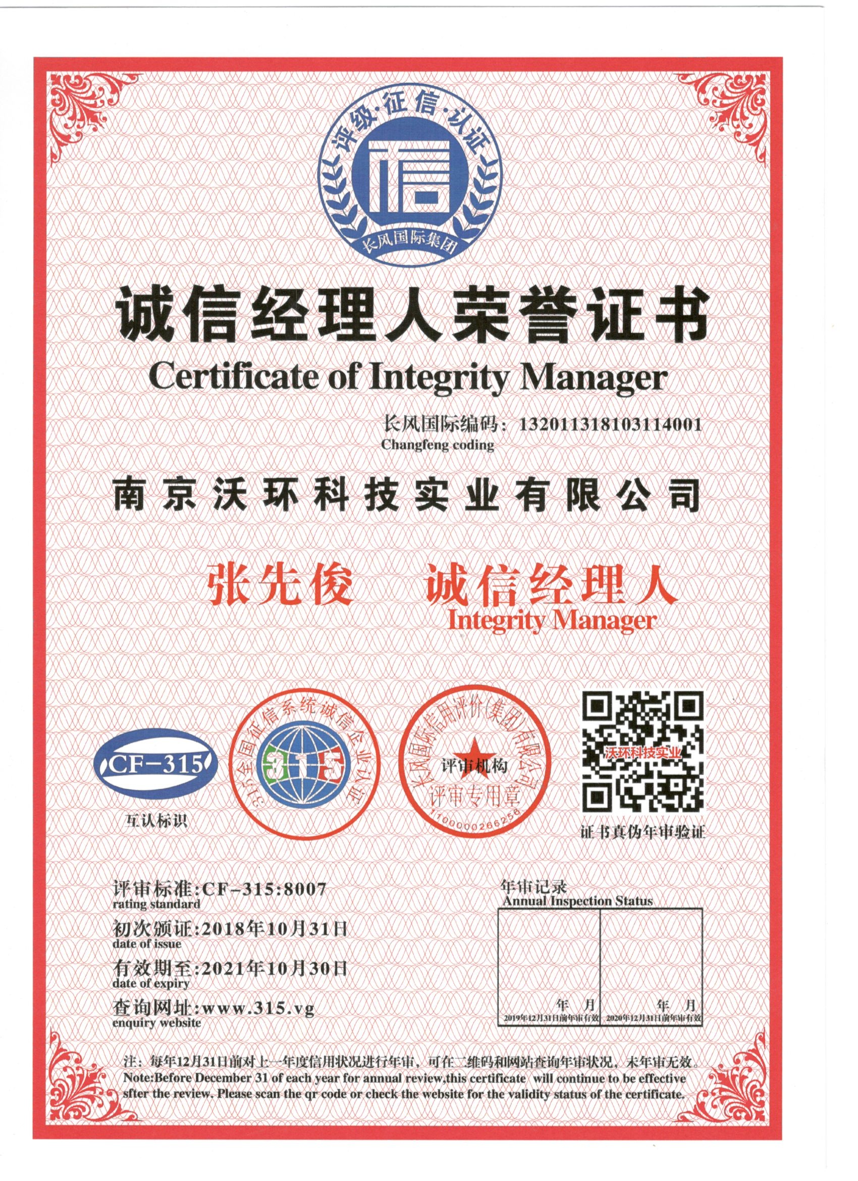 熱烈祝賀南京沃環(huán)公司張先俊先生榮獲誠(chéng)信經(jīng)理人證書 |
