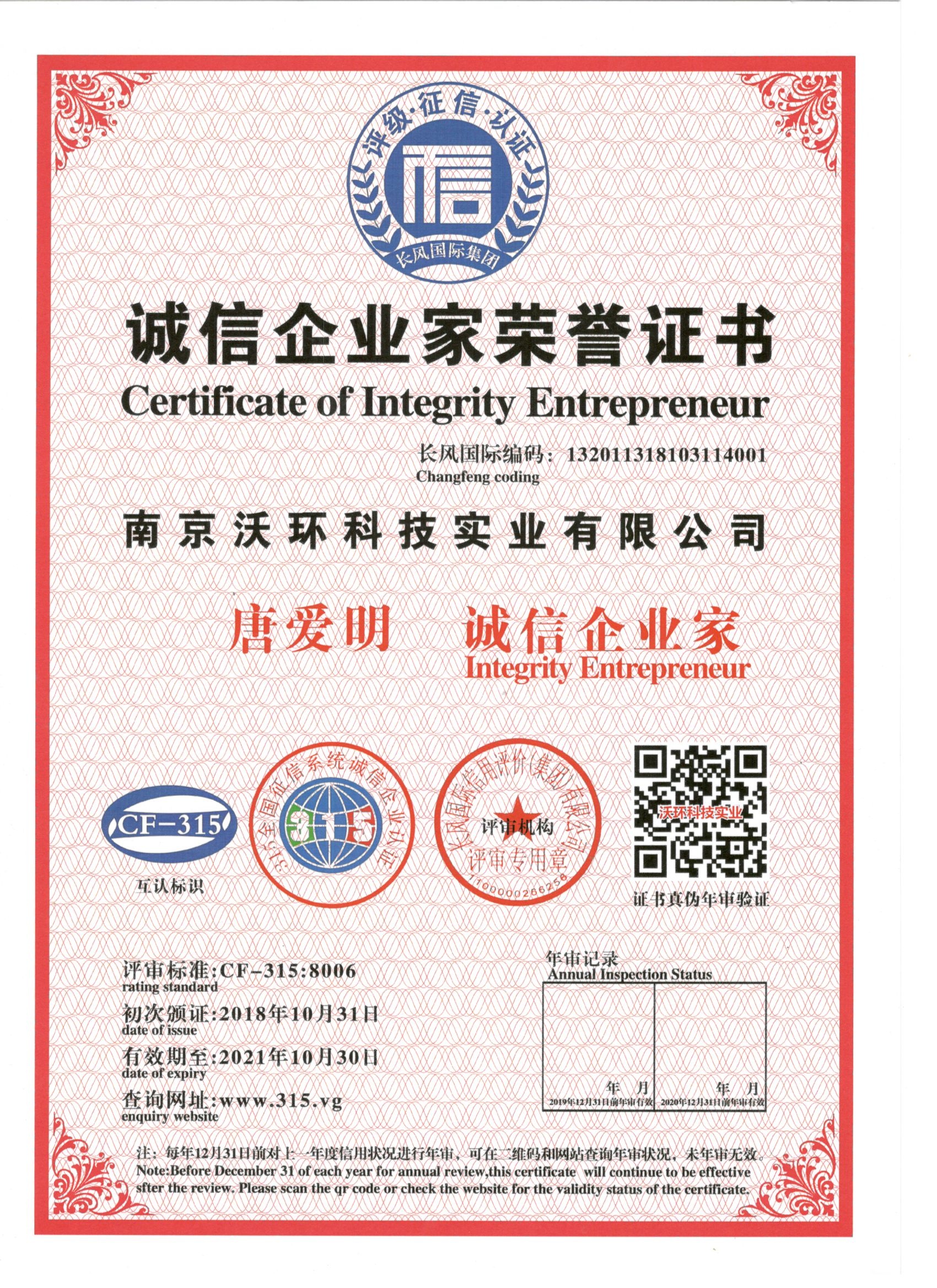 熱烈祝賀南京沃環(huán)公司唐愛明先生被專業(yè)評(píng)審機(jī)構(gòu)-長風(fēng)國際集團(tuán)評(píng)為誠信企業(yè)家,特發(fā)此證書